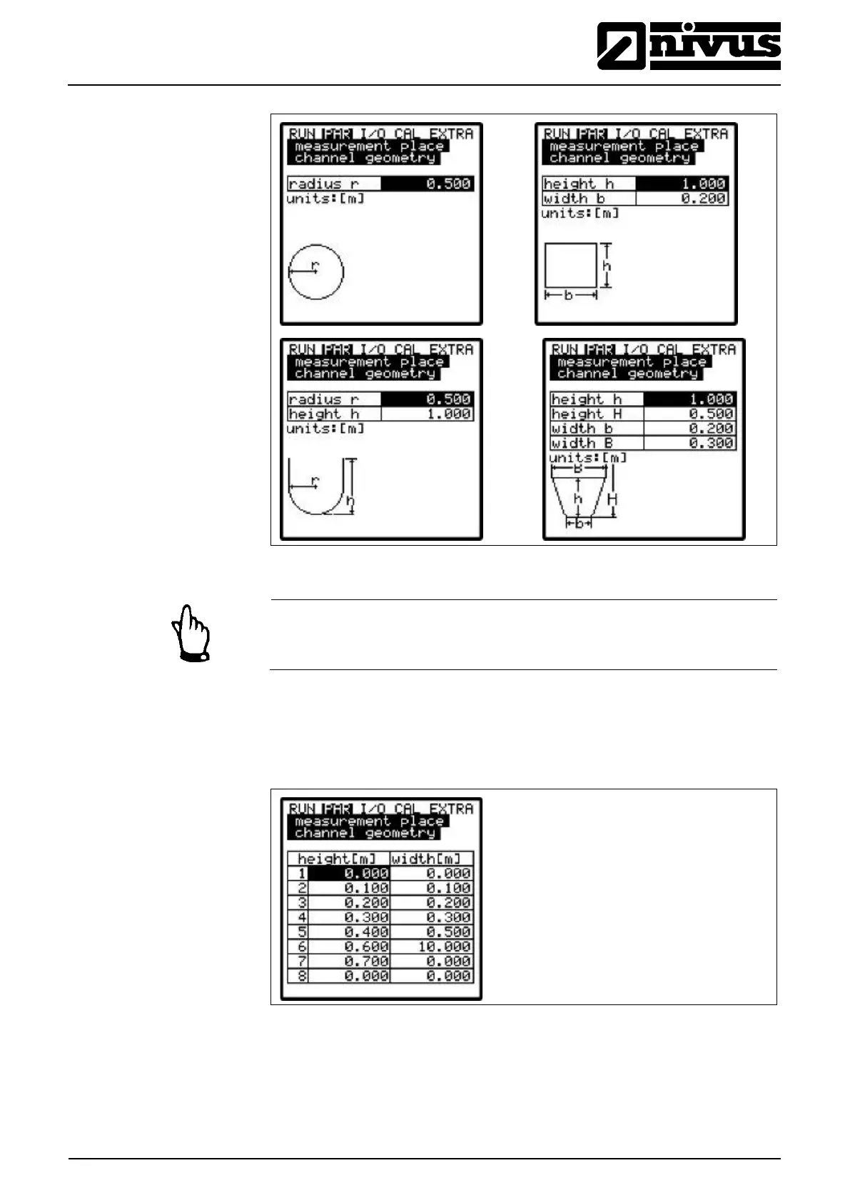 Fig. 9-26 Screens showing various channel dimensions
