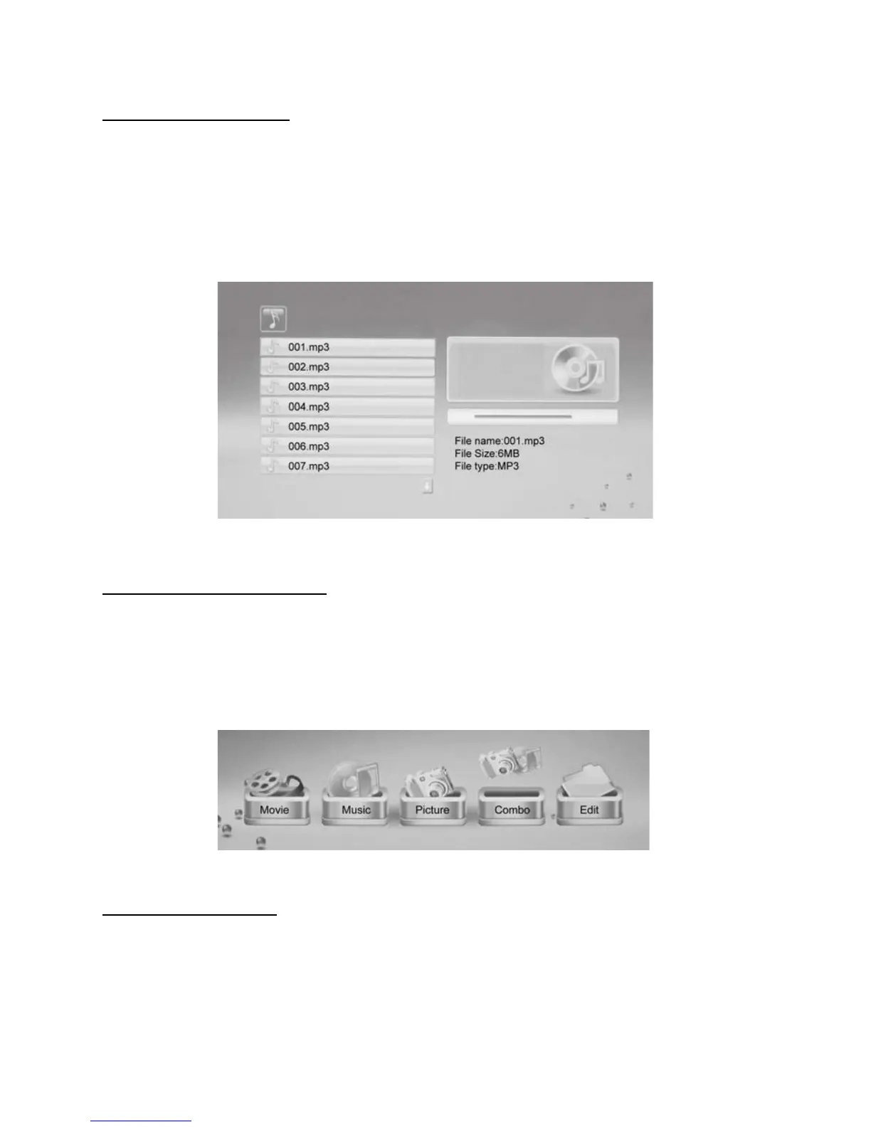 Select the Music icon from the Menu, then press ENTER. Your Music files will list on the