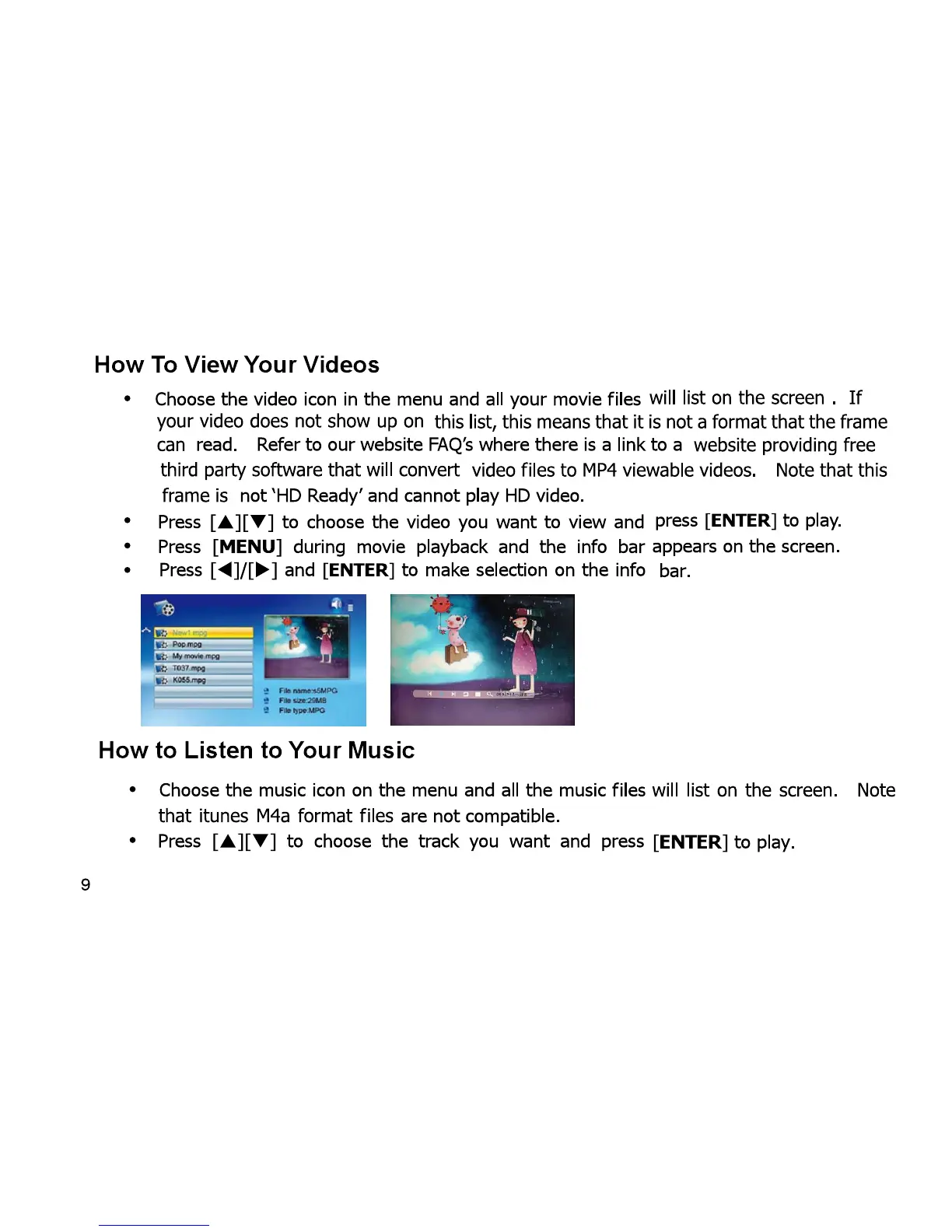 NIX X15A - How To View Your Videos; Video Playback and Format Notes; How to Listen to Your Music; Music Playback and Format Notes