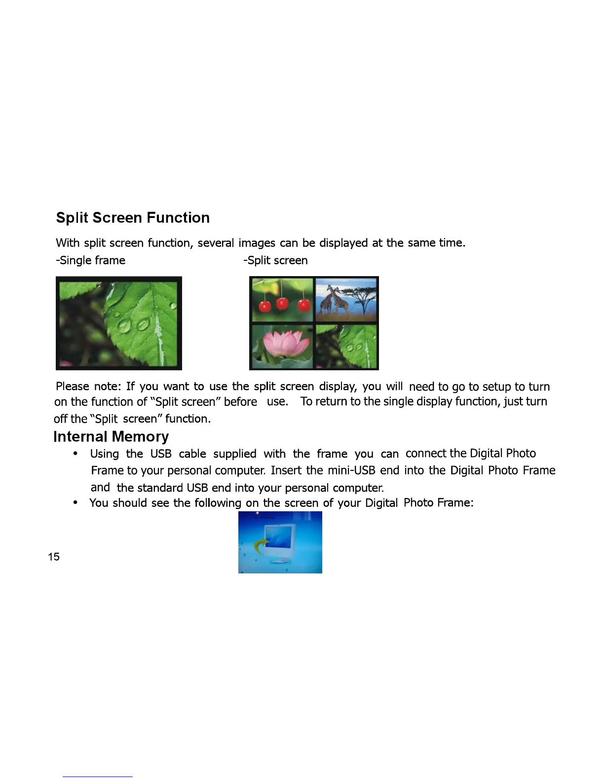 NIX X15A - Split Screen Function; Using Split Screen Display; Internal Memory and PC Connection; Connecting to a Computer