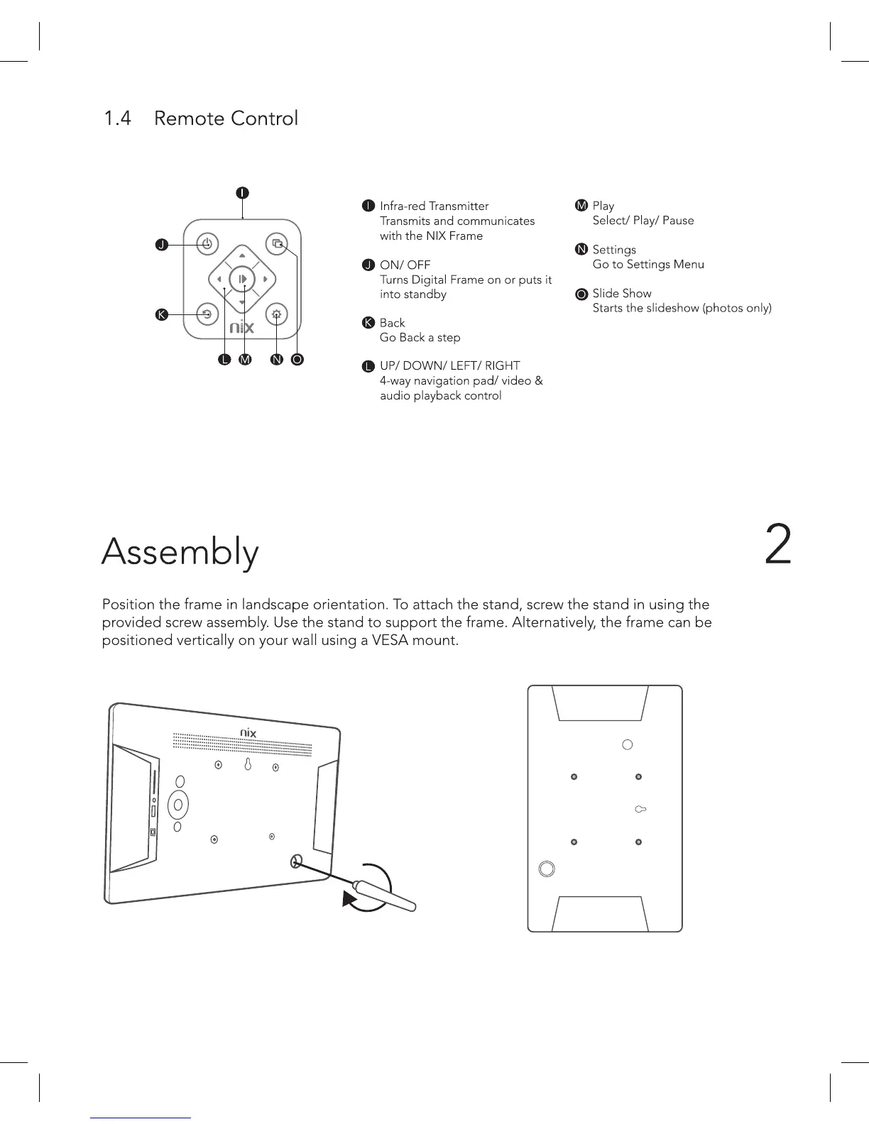 NIX X17B - Remote Control Overview; Assembly and Setup; Frame Assembly and Placement