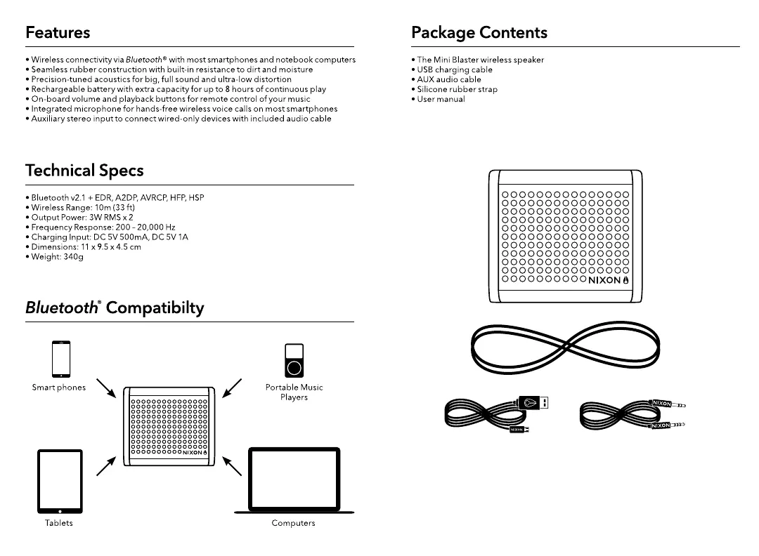 NIXON mini blaster - Features; Package Contents; Technical Specs; Bluetooth Compatibilty