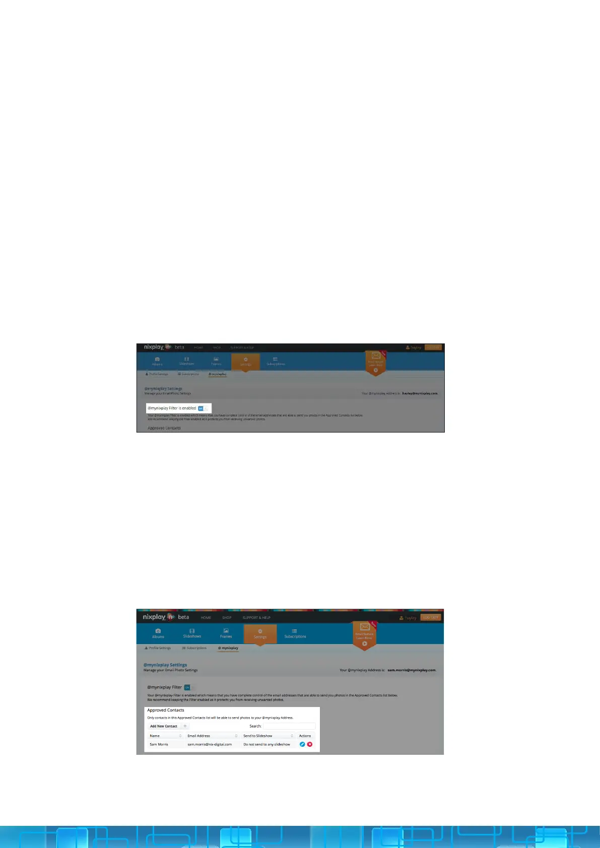 The @mynixplay email address you use to send messages to your Frame
