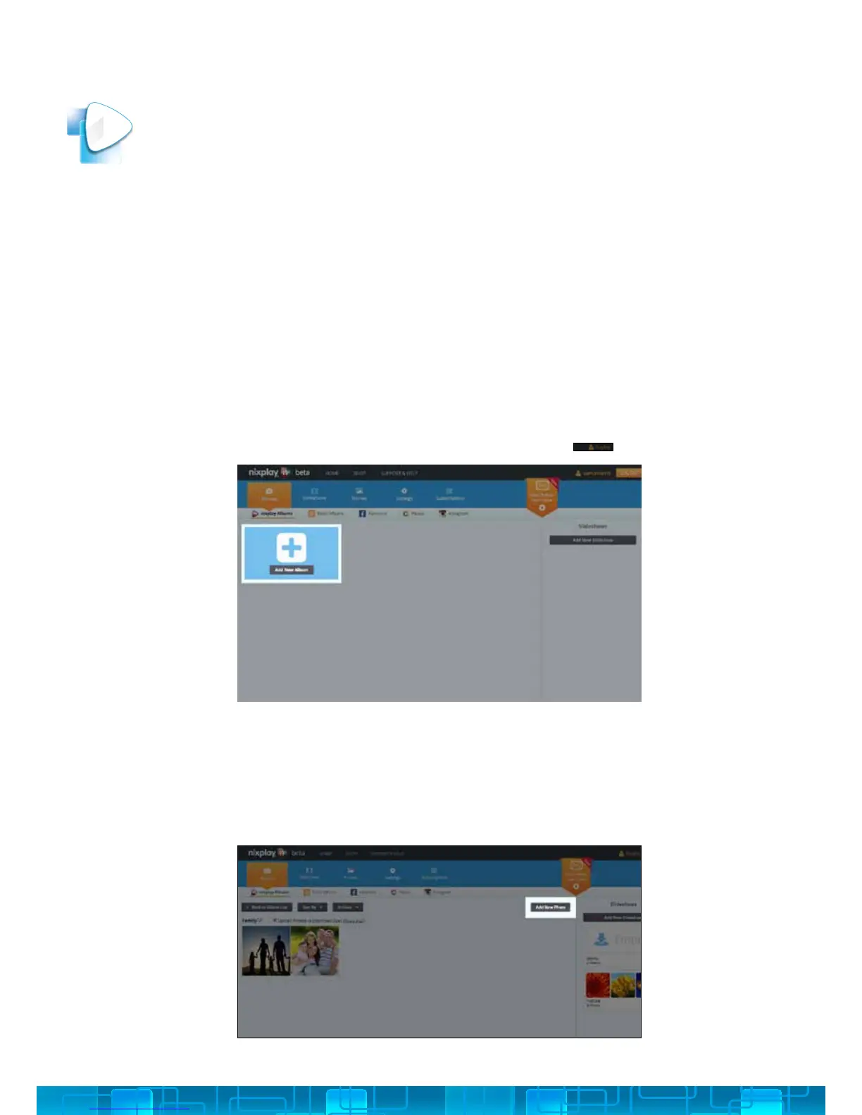 Nixplay W15A - NIXPLAY CLOUD ACCOUNT; PHOTOS, ALBUMS & SLIDESHOWS; CREATING AN ALBUM; ADDING PICTURES TO AN ALBUM