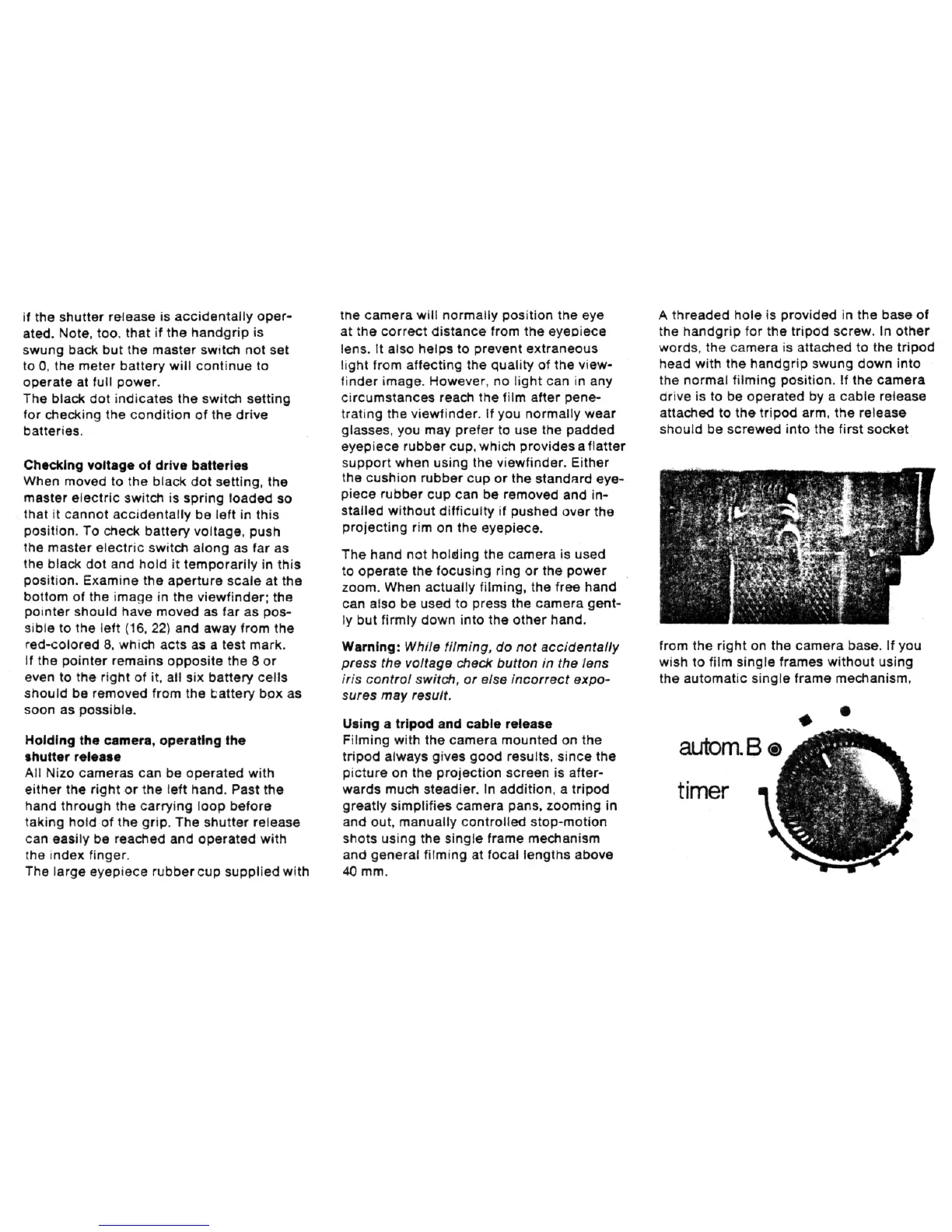Nizo 801 macro - Checking voltage of drive batteries; Holding the camera, operating the shutter release; Using a tripod and cable release