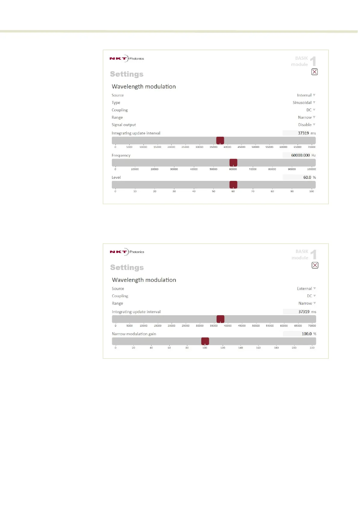 NKT Koheras BASIK - Figure 27 Wavelength Modulation - Internal Source; Figure 28 Wavelength Modulation - External Source