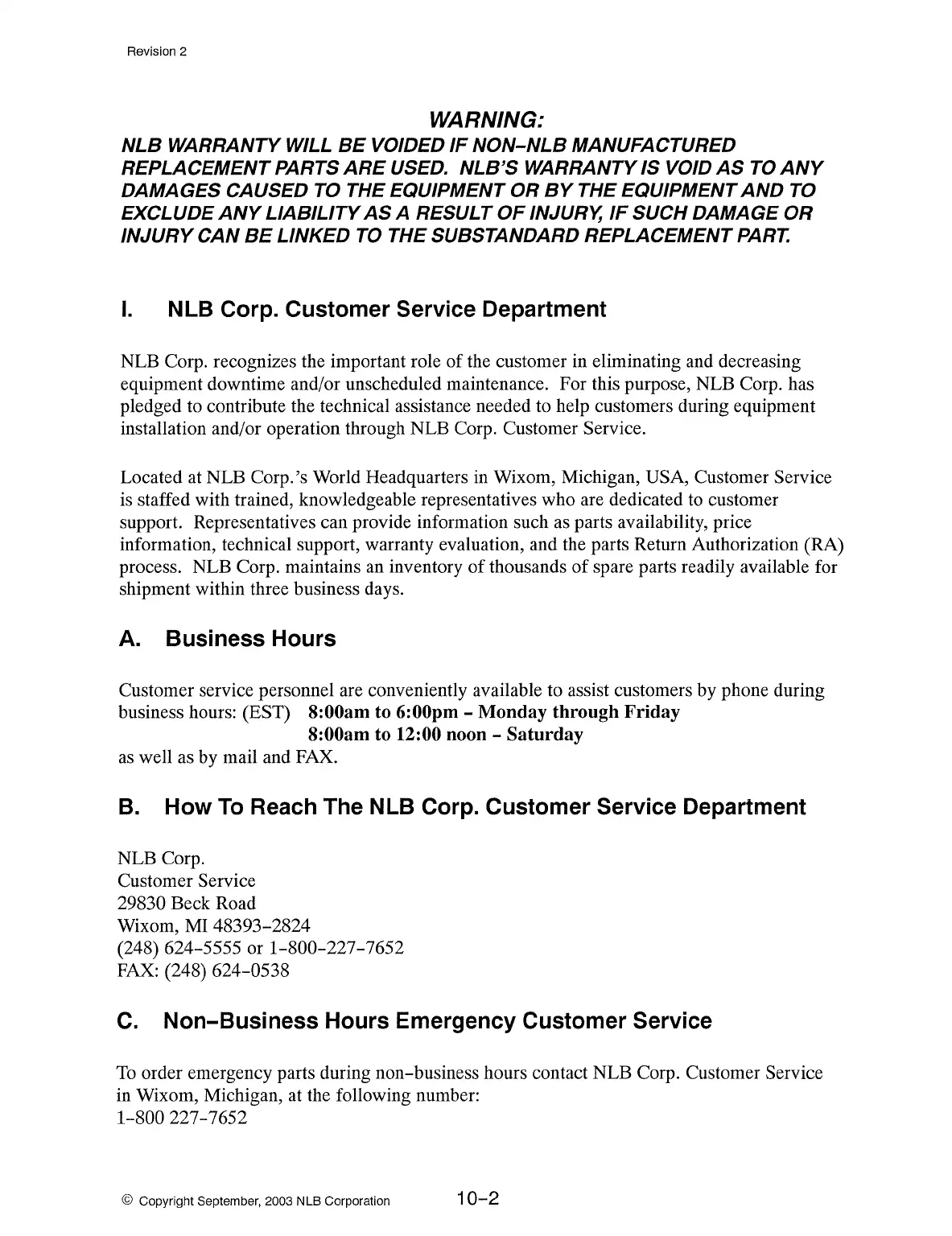 order emergency parts during non-business hours contact NLB Corp. Customer Service