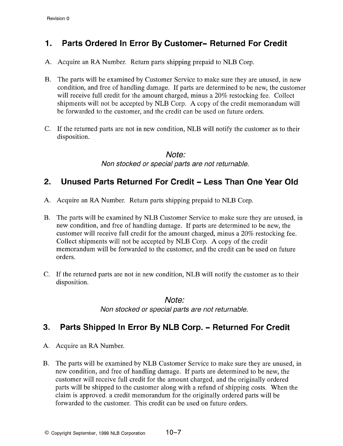 2. Unused Parts Returned For Credit - Less Than One Year
