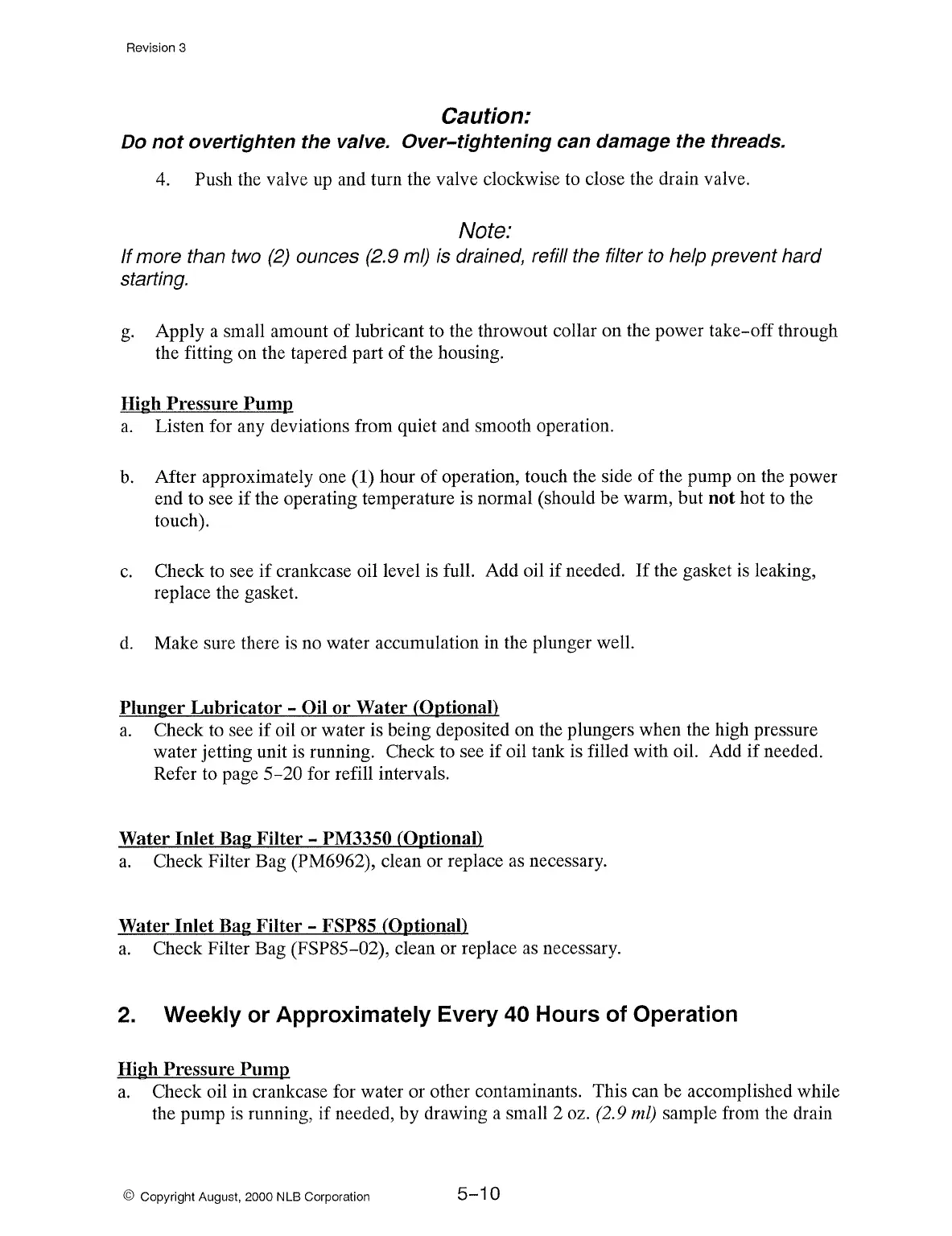 Weekly or Approximately Every 40 Hours of Operation
