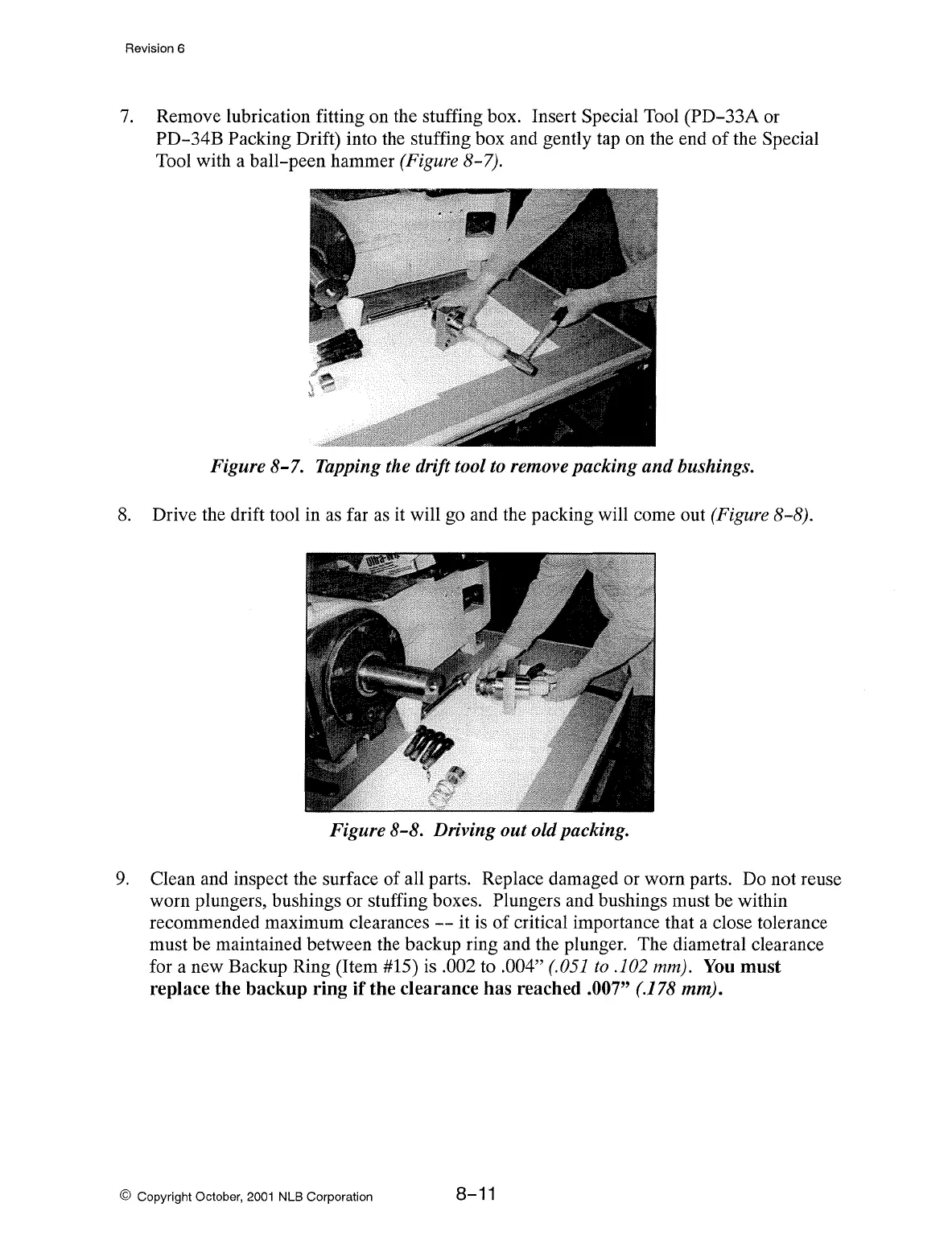 worn plungers, bushings or stuffing boxes. Plungers and bushings must be within
