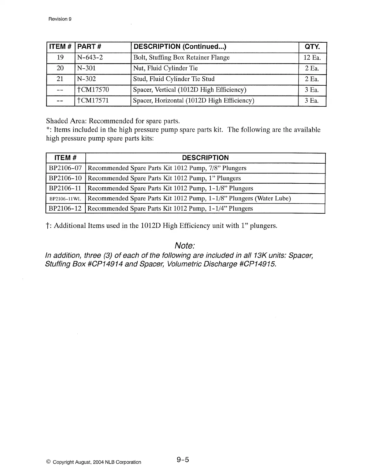Shaded Area: Recommended for spare parts.