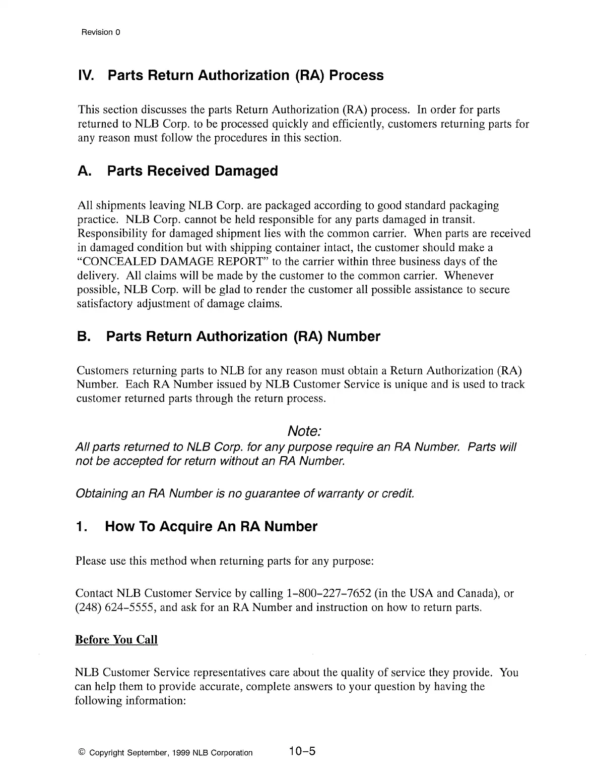 This section discusses the parts Return Authorization (RA) process. In order for parts