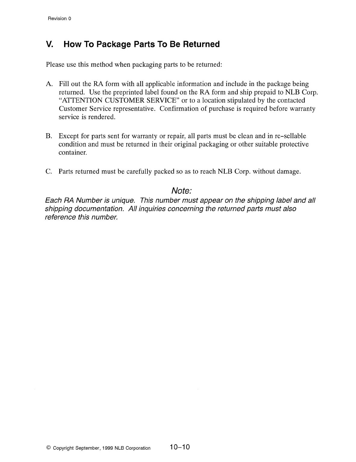 Parts returned must be carefully packed so as to reach NLB Corp. without damage.