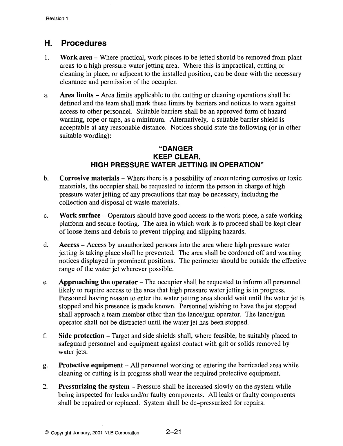 likely to require access to the area that high pressure water jetting is in progress.