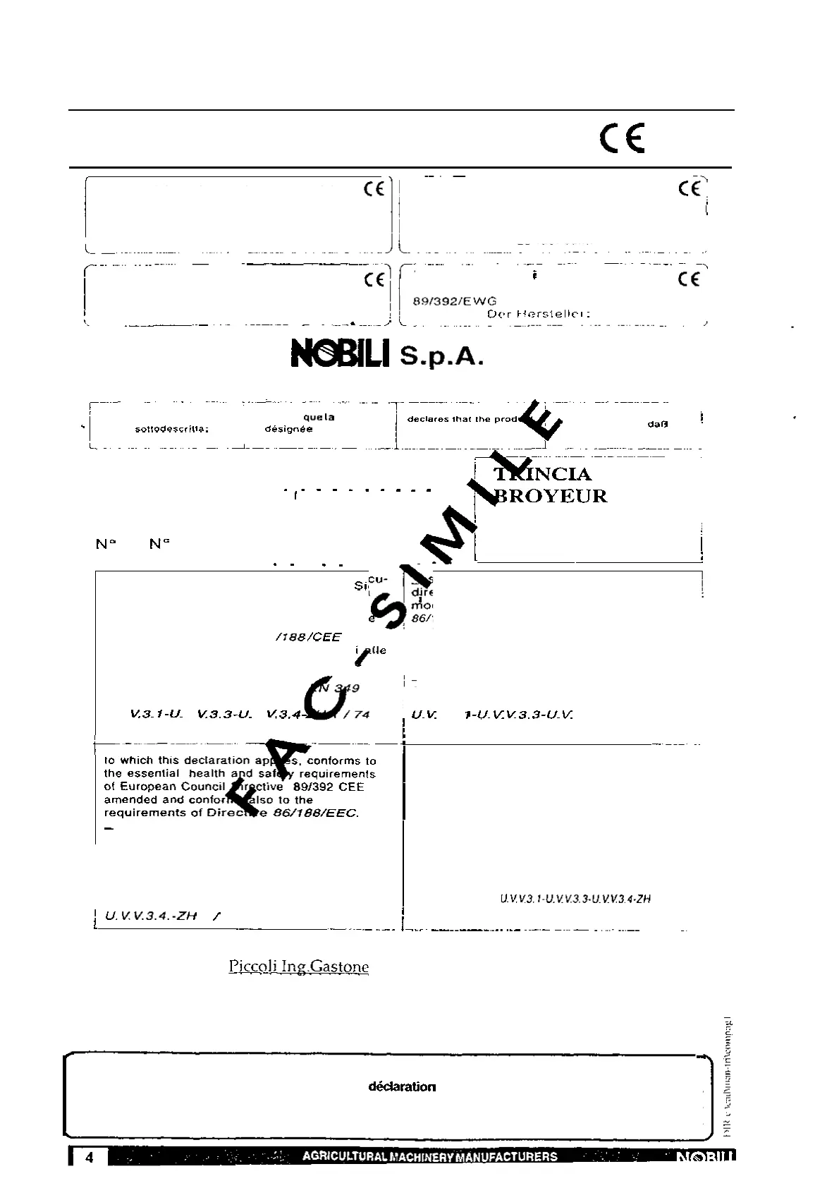 In caso di vendita della macchina, la presente dichiarazione deve essere consegnata all'acquirente.
