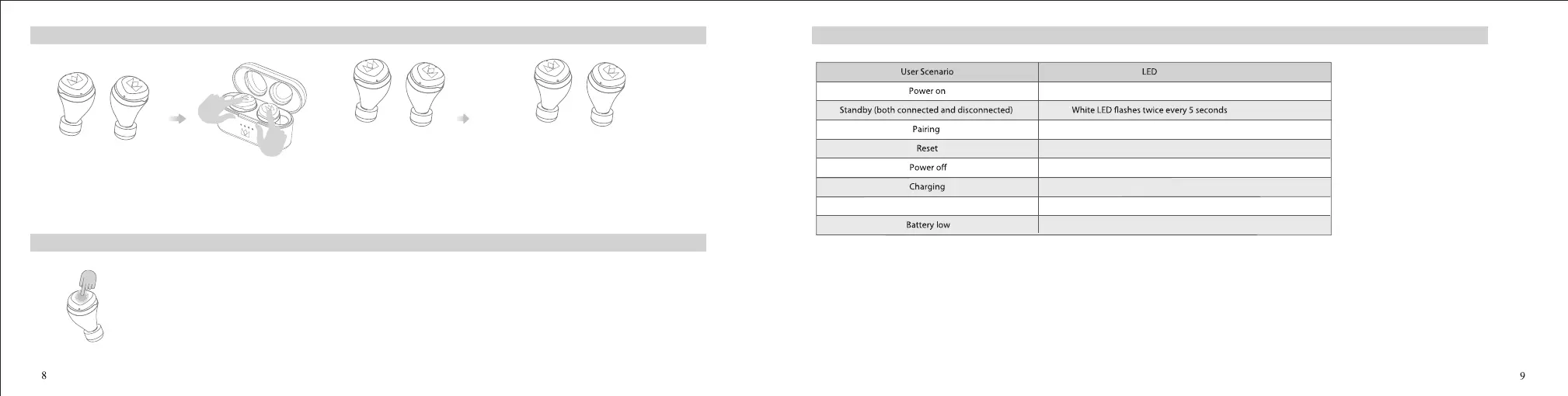 When the charging case has sucient charge, put your earbuds into the charging case and make sure its orange LED light is on. Then press and hold the left and right MFB for 10s and release,