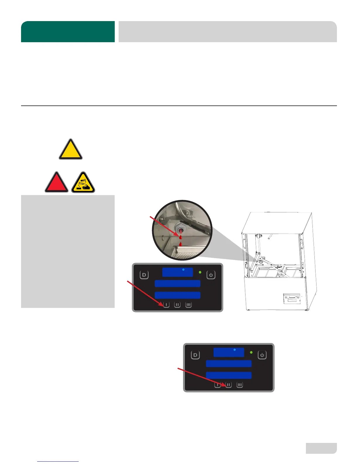 3. To prime the rinse-aid pump, press the II button and hold for one minute. The
