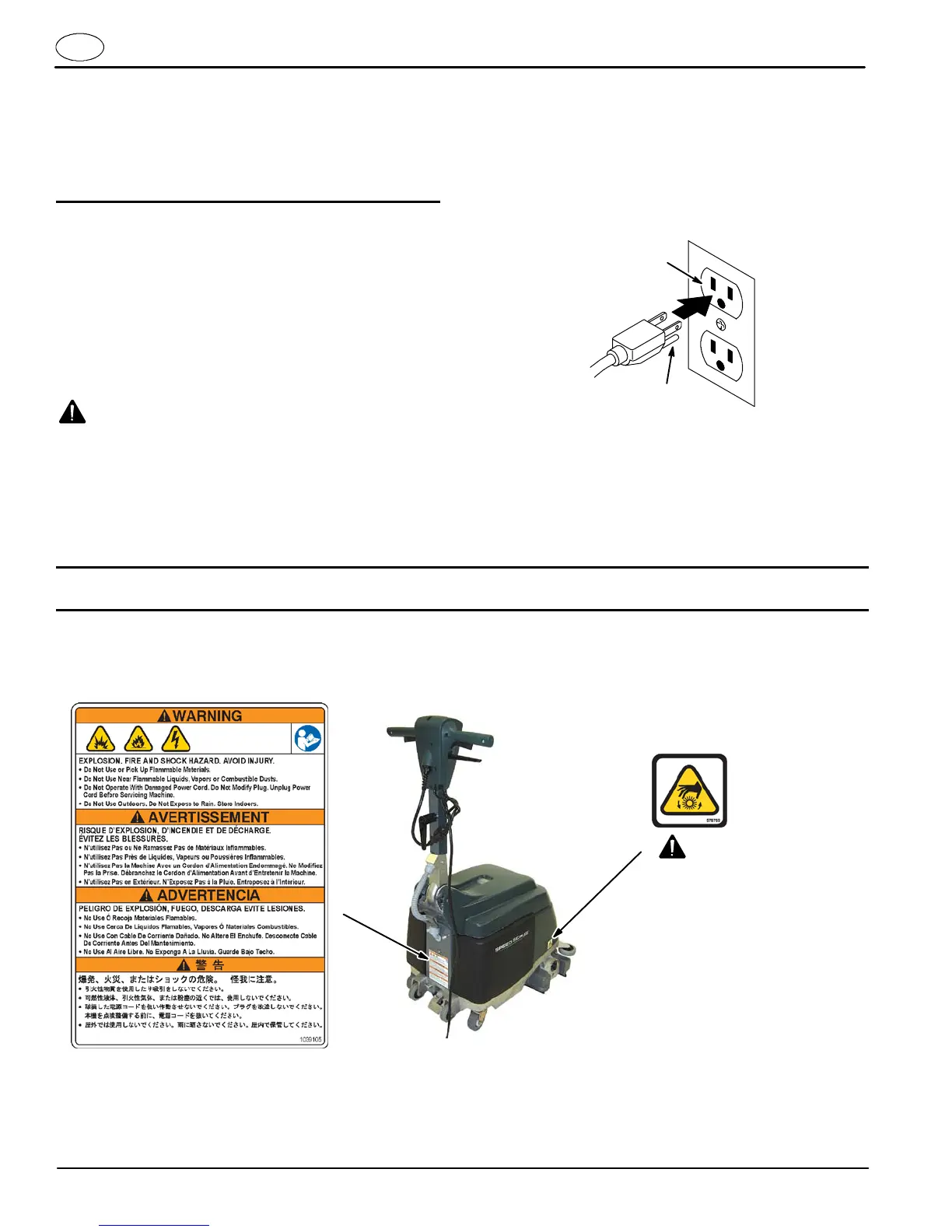 The safety labels appear on the machine in the locations indicated. Replace labels if they are missing or become