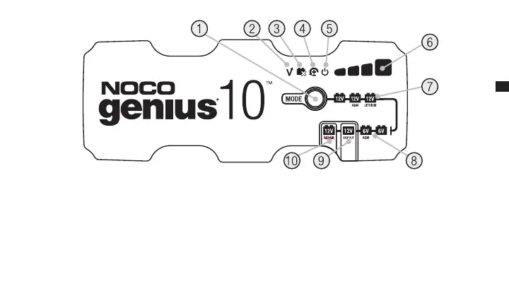 6.) Lade LED indikerer ladetilstand for tilkoblet batteri.