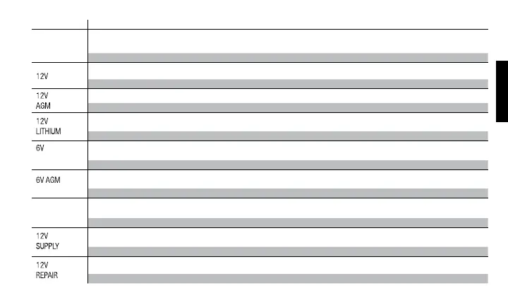 Untuk mengecas bateri-bateri Sel Basah, Sel Gel, Terendam Dipertingkat, Tanpa Penyelenggaraan dan Kalsium berkadar 12 volt. Apabila dipilih, LED 12V