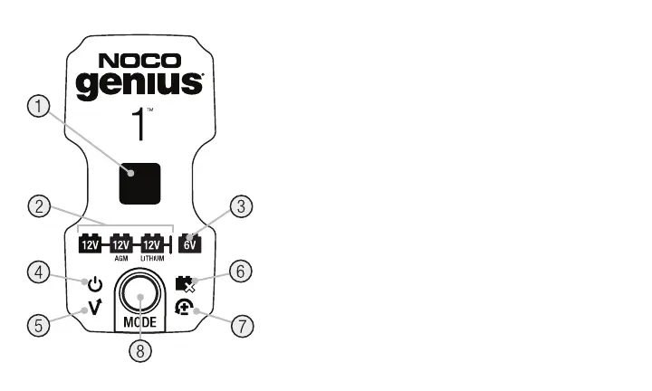 2.) 模式LED 指示充电器当前所处的充电模式。按“模式”按钮可循