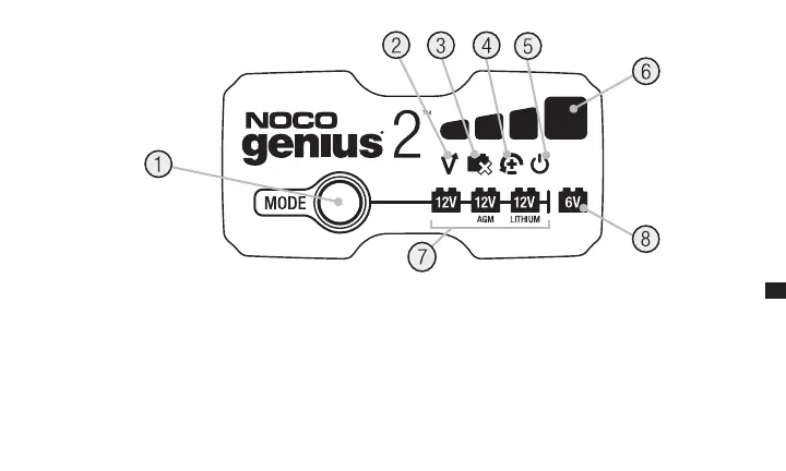 6.) Laadimise LED-tuli Näitab ühendatud aku(d) laetuse olekut.