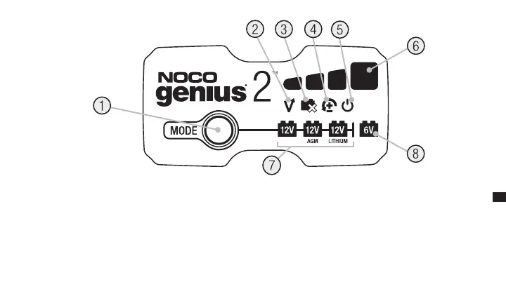 6.) Įkrovimo LED Nurodo prijungto (-ų) akumuliatoriaus (-ių) įkrovos lygį.