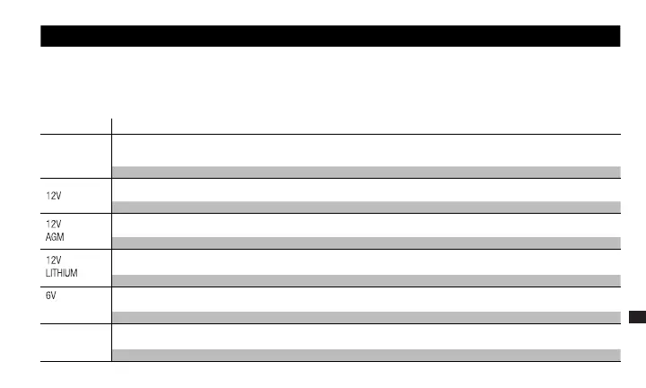 Untuk mengecas bateri-bateri Sel Basah, Sel Gel, Terendam Dipertingkat, Tanpa Penyelenggaraan dan Kalsium berkadar 6 volt. Apabila dipilih, LED 6V