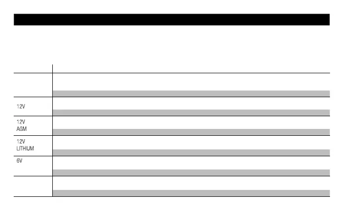 用於給6伏濕電池、膠體電池、增大滿槽電池、免維護電池及鈣電池充電。選擇後,白色的6V LED燈會亮起。