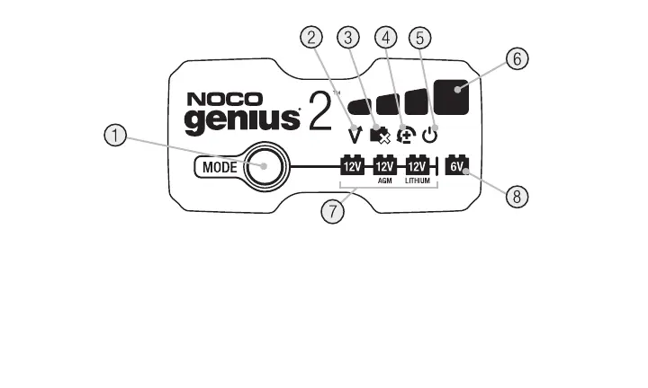 7.) 模式LED燈 指示充電器當前所處的充電模式。按下「模