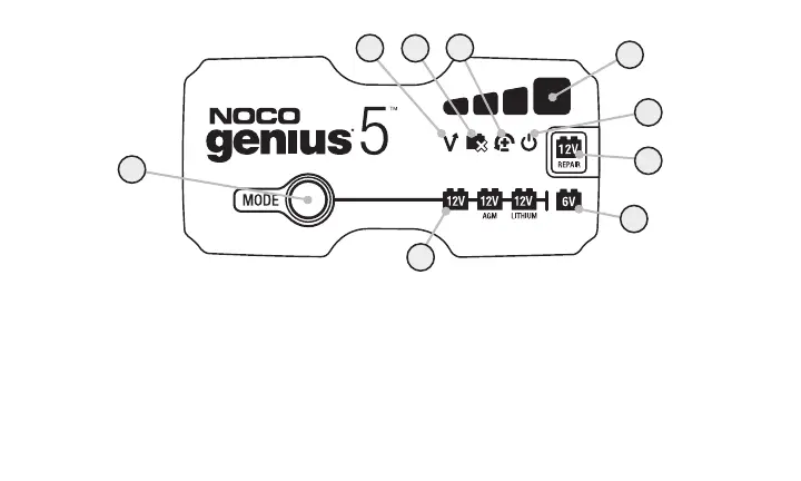 5.) DEL de charge indique l’état de charge de la(des) batterie(s) connectée(s).