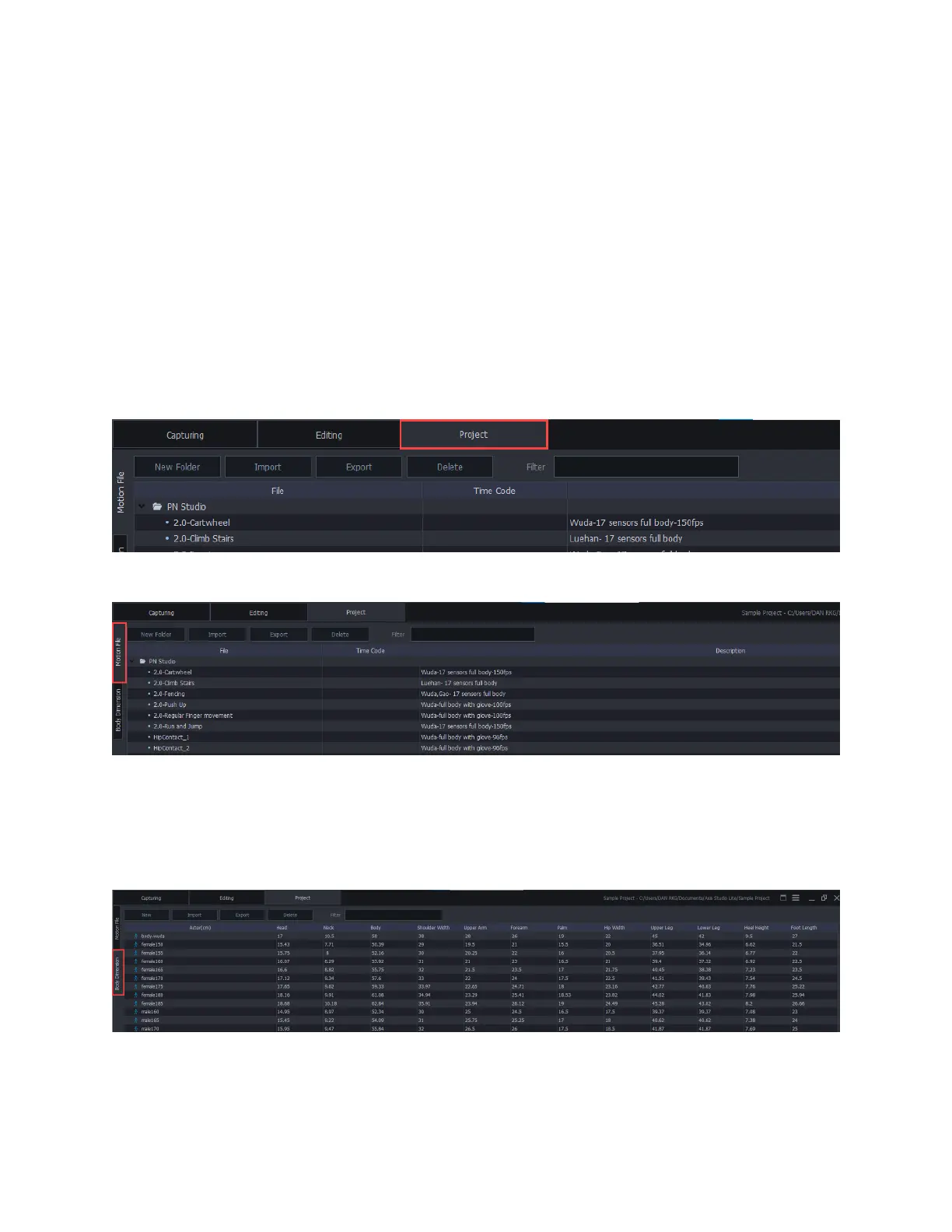 In the project window, users can manage recorded files and body size dimensions included in the project.