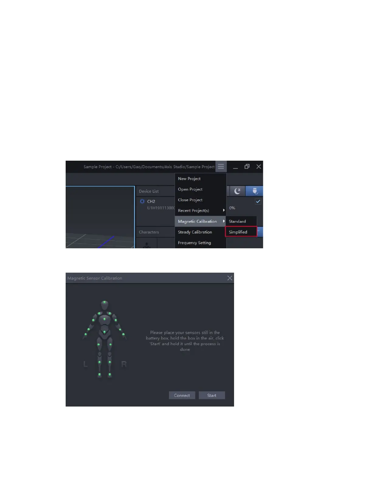5. Click “Connect” button first, then click the “Start” button after sensors light up