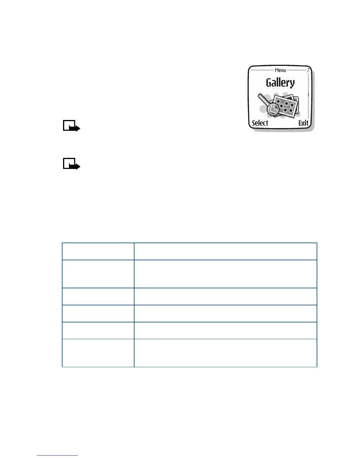 At the start screen, press Menu 7 (Gallery). After a brief pause, the