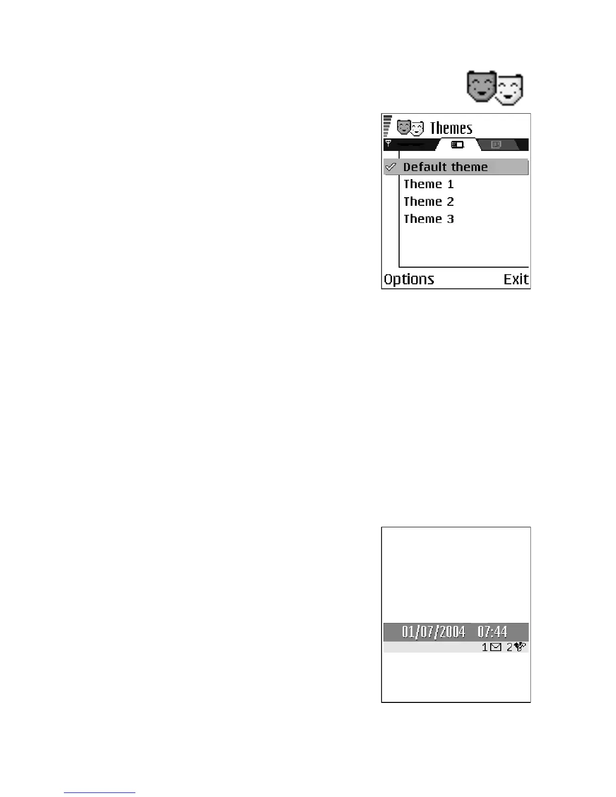 Options in Themes are Preview, Apply, Edit, Copy to mem. card, Copy to phone mem.,