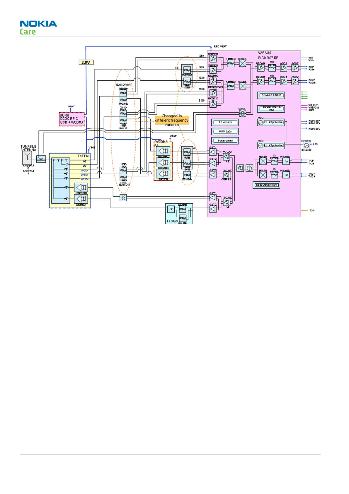The RF block diagram uses RF ASIC N7500 (Vapaus) that performs the RF back-end functions of receive and