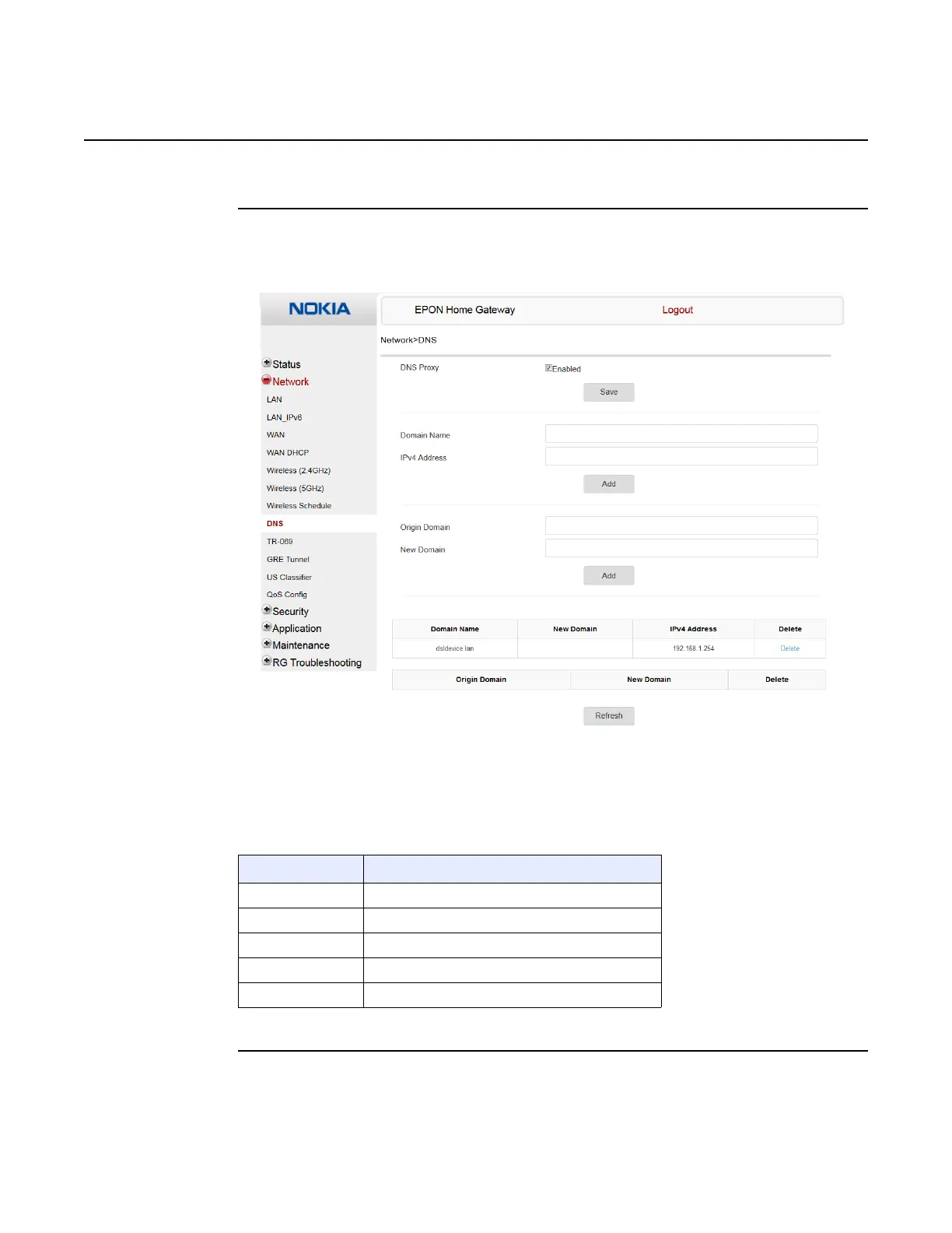 1 Select Network > DNS from the top-level menu in the EPON Home Gateway window, as