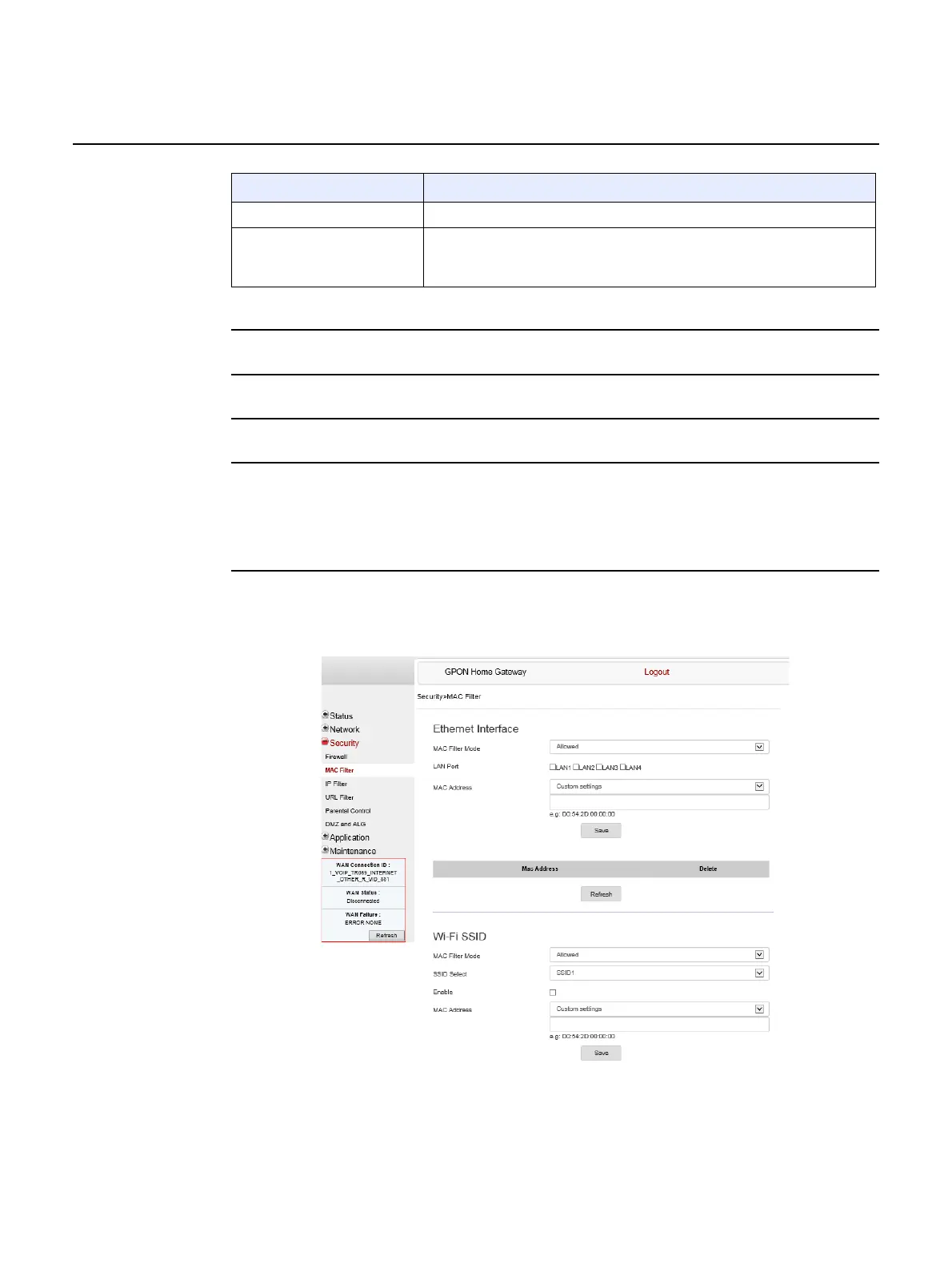 1 Select Security > Mac Filter from the top-level menu in the GPON Home Gateway window,
