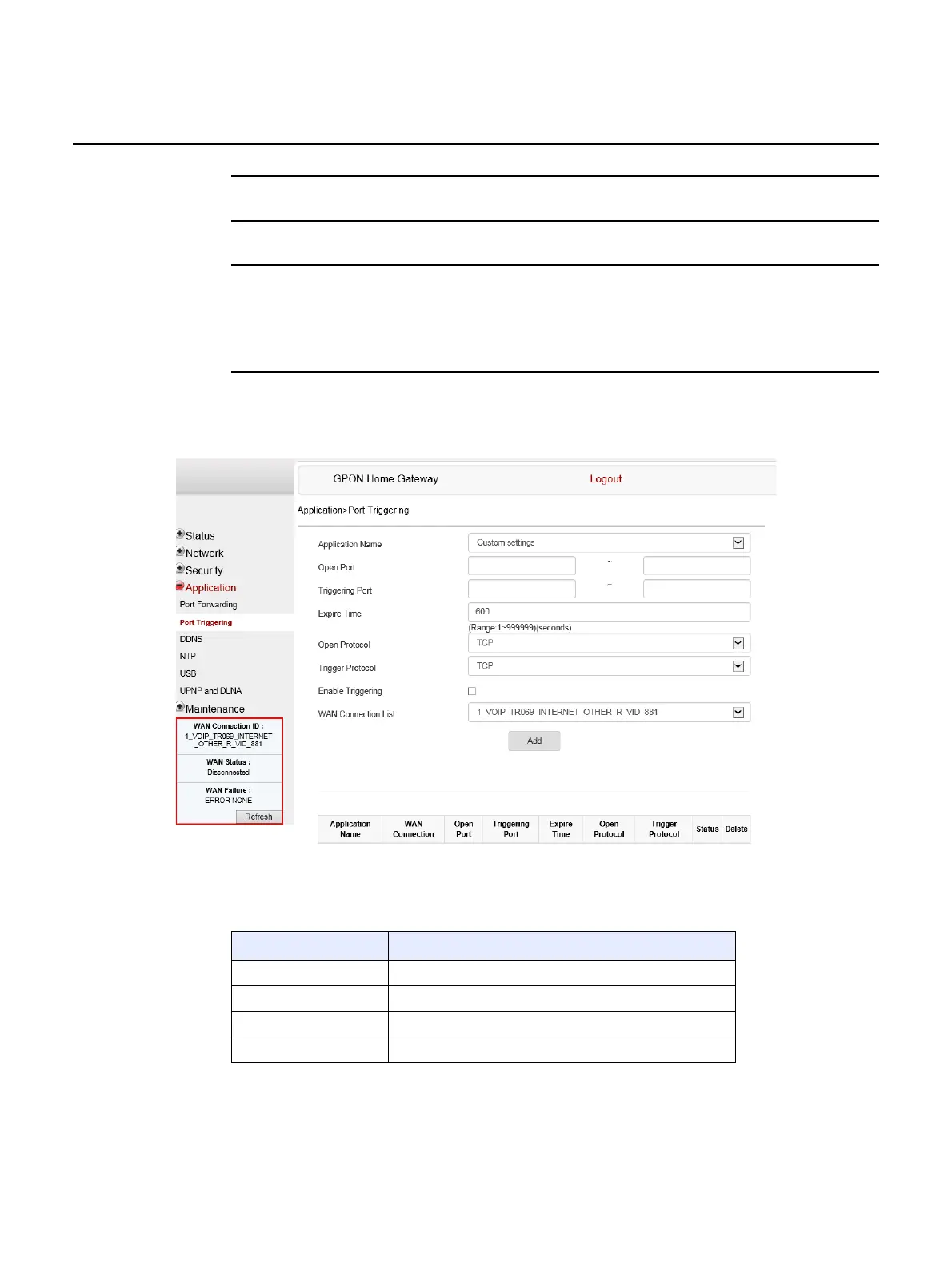 1 Select Application > Port Triggering from the top-level menu in the GPON Gateway window,