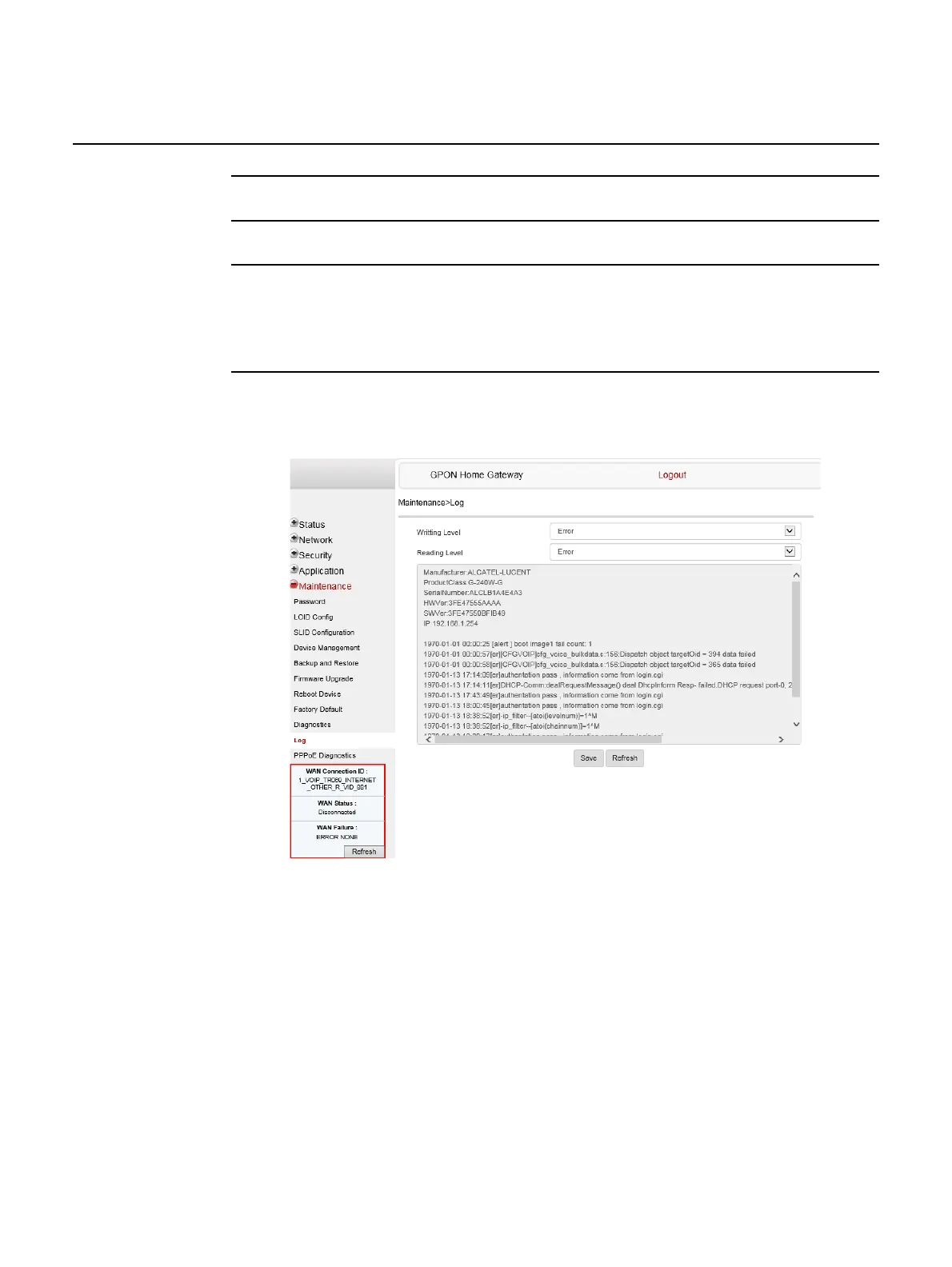 1 Select Maintenance > Log from the top-level menu in the GPON Home Gateway window, as