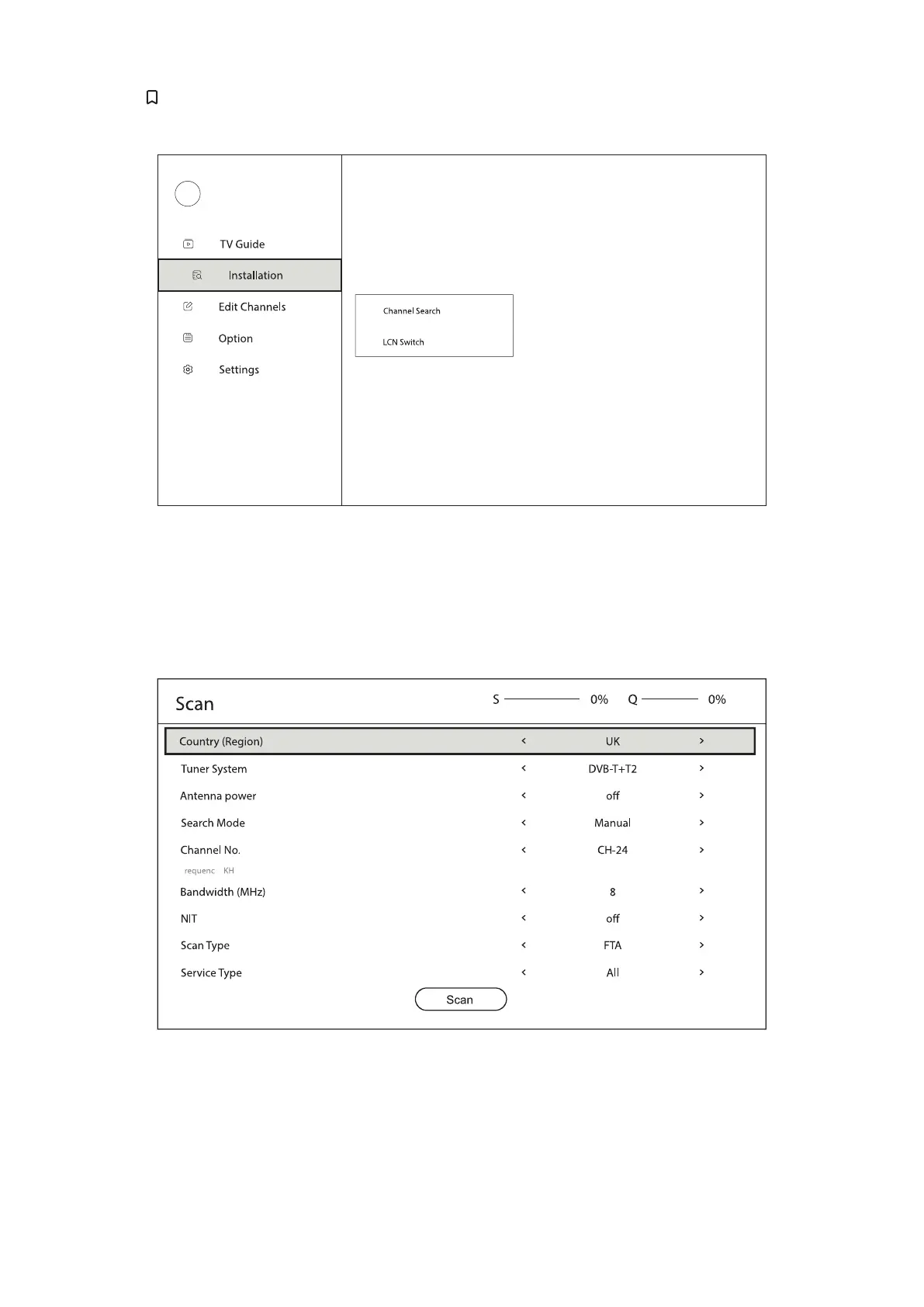 Press the button on your remote control and select Installation to display this menu.