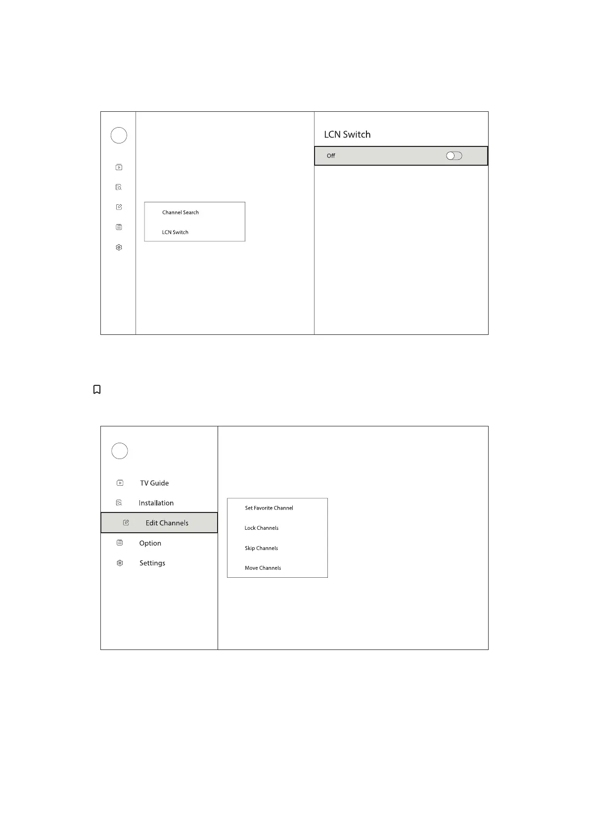 transmitted over broadcast multiplexes. Enable or disable the LCN switch in this menu.