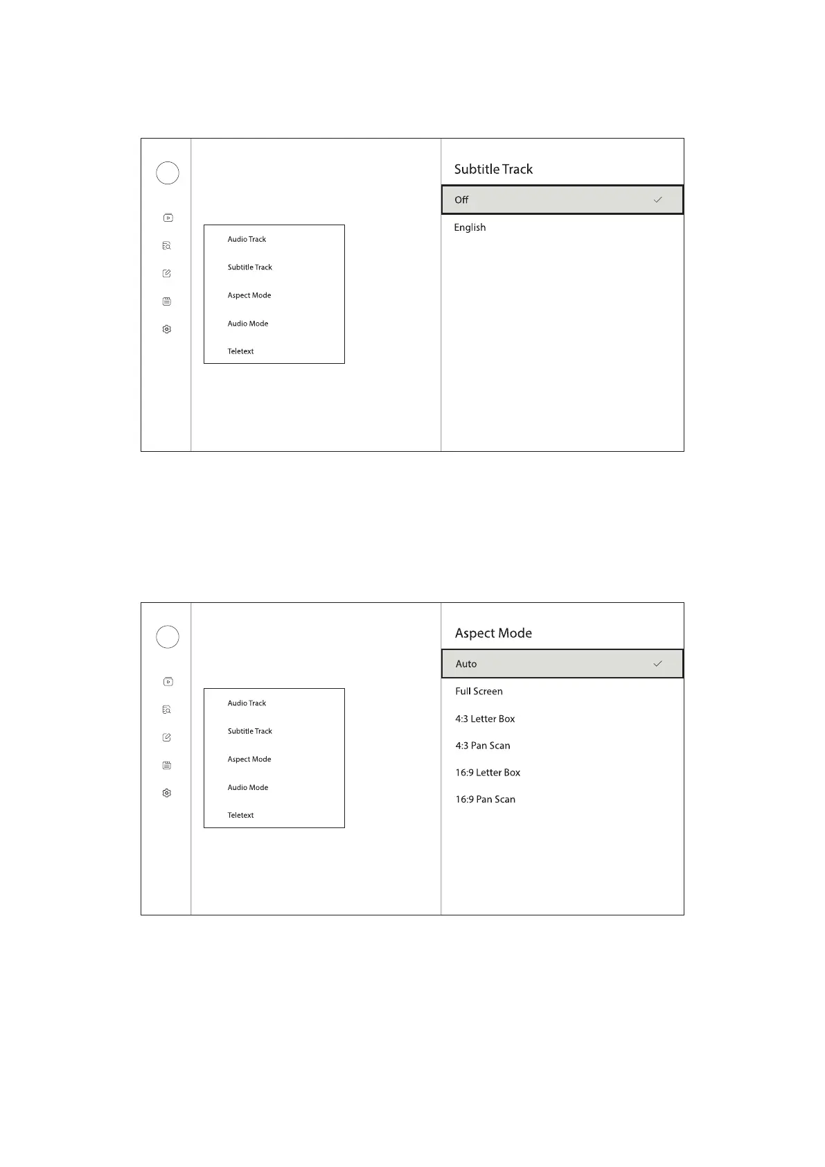 Select your preferred aspect mode by choosing between Auto, Full Screen, 4:3 Letter Box, 4:3 Pan Scan, 16:9 Letter Box,