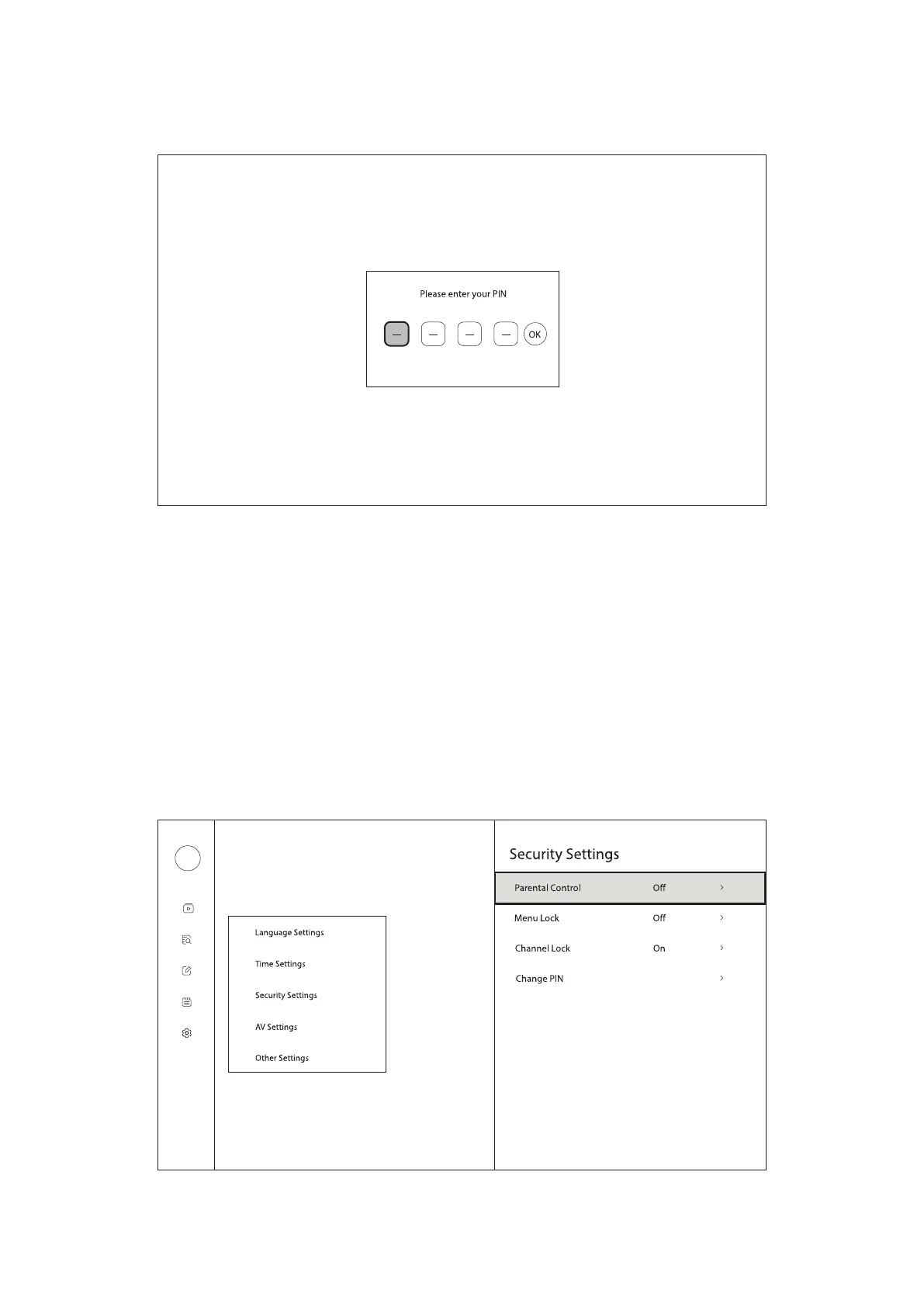 Change PIN: Change the pin to enter the security settings and to view locked and skipped channels. (Default Pin: 0000)