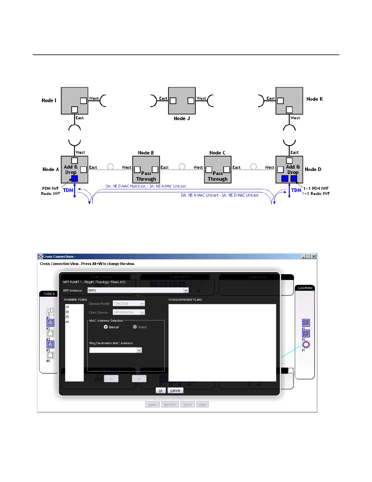 Configure a Radio-Ring or PDH-Ring cross-connection on Node A, see