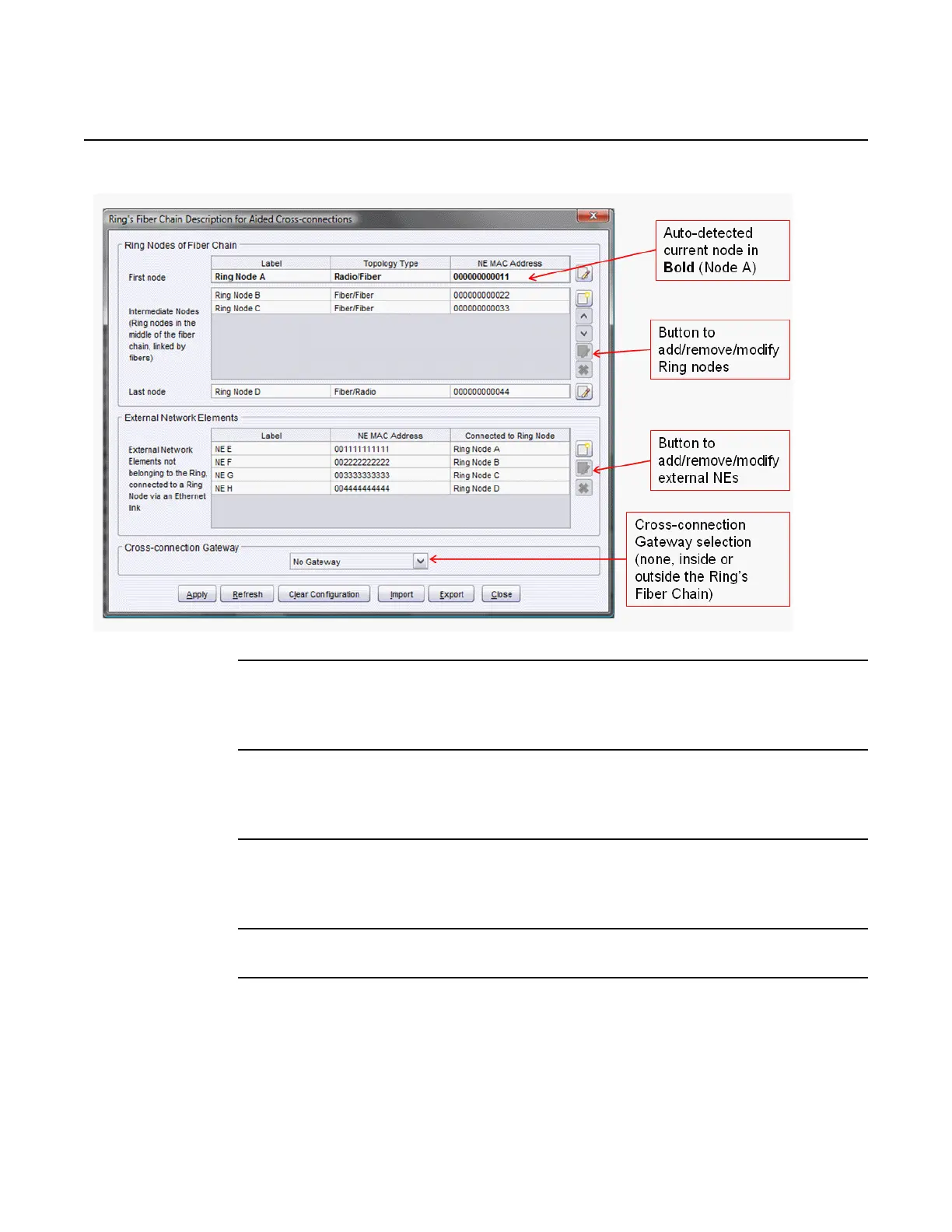 Enter the label, topology type and NE MAC address for each node in the fiber