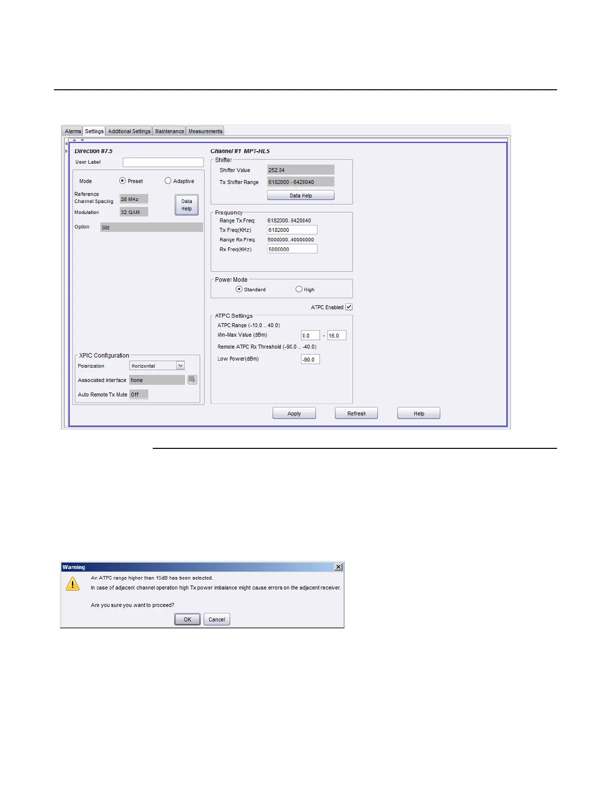 If the ATPC Range is over 15 dBm, a warning window appears; see