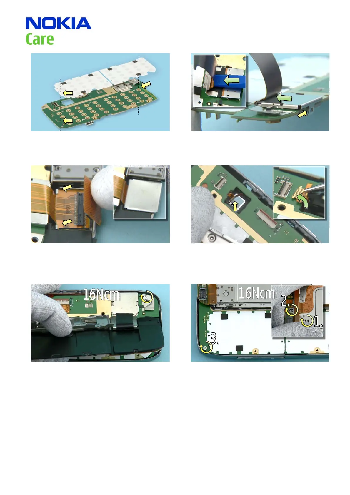 5) Tighten the screw to the torque of 16 Ncm. 6) Tighten the screws to the torque of 16 Ncm in the