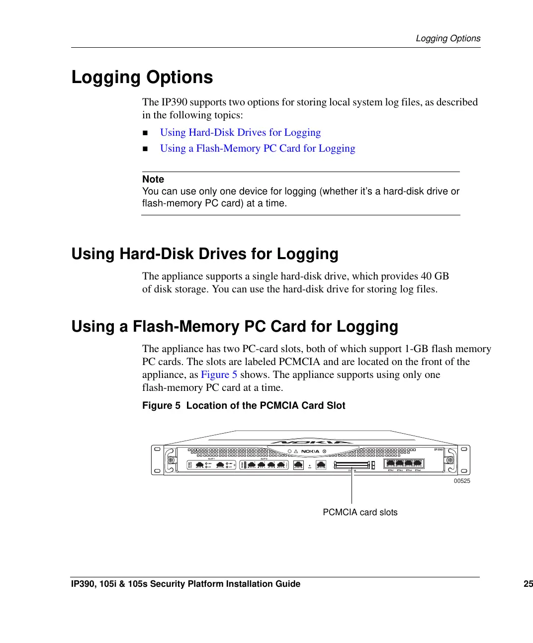 The IP390 supports two options for storing local system log files, as described