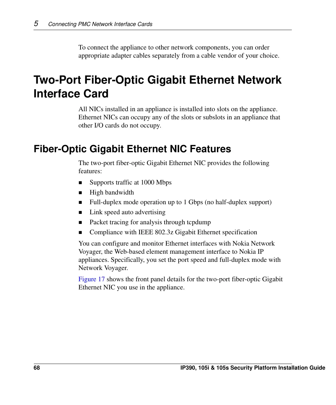 The two-port fiber-optic Gigabit Ethernet NIC provides the following